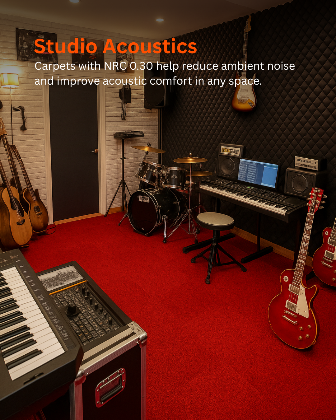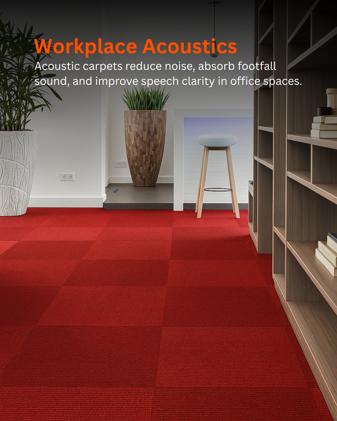 Acoustic Carpet Tiles combine luxurious flooring aesthetics with effective sound absorption and comfort. Made from high-density polyester fiber with a soft felt backing, they reduce impact noise, footsteps, and sound reflections while adding warmth and elegance to interiors. Ideal for offices, hotels, home theatres, classrooms, and luxury homes, they enhance both style and acoustic performance.