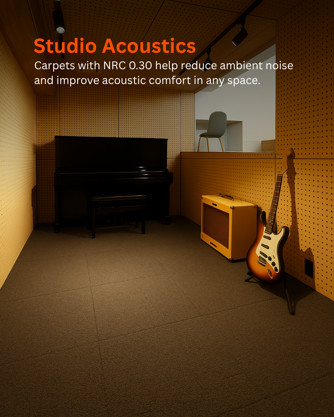 Acoustic Carpet Tiles combine luxurious flooring aesthetics with effective sound absorption and comfort. Made from high-density polyester fiber with a soft felt backing, they reduce impact noise, footsteps, and sound reflections while adding warmth and elegance to interiors. Ideal for offices, hotels, home theatres, classrooms, and luxury homes, they enhance both style and acoustic performance.