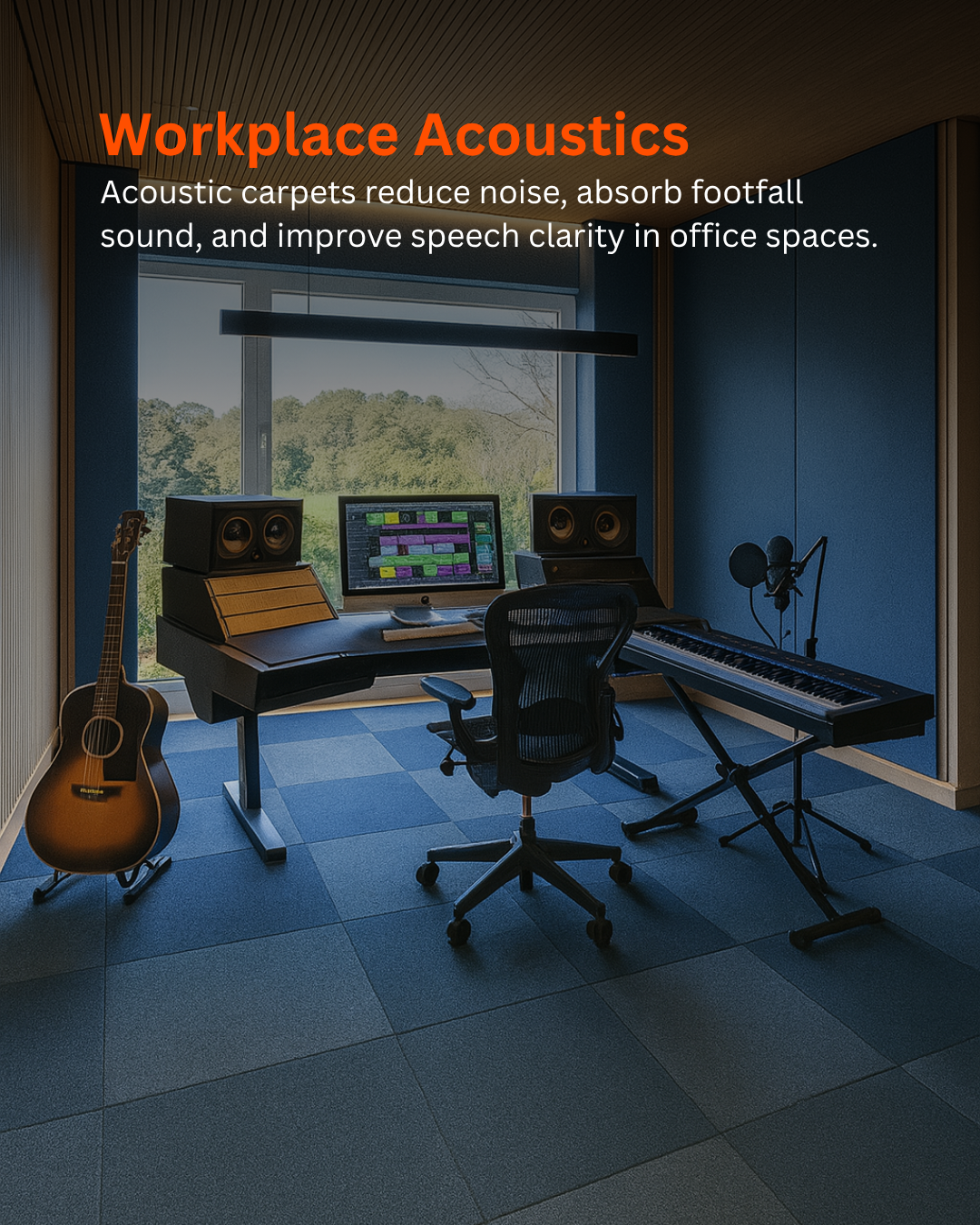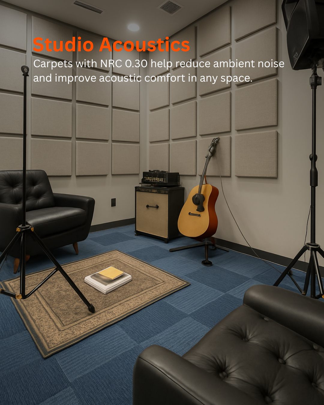 Acoustic Carpet Tiles combine luxurious flooring aesthetics with effective sound absorption and comfort. Made from high-density polyester fiber with a soft felt backing, they reduce impact noise, footsteps, and sound reflections while adding warmth and elegance to interiors. Ideal for offices, hotels, home theatres, classrooms, and luxury homes, they enhance both style and acoustic performance