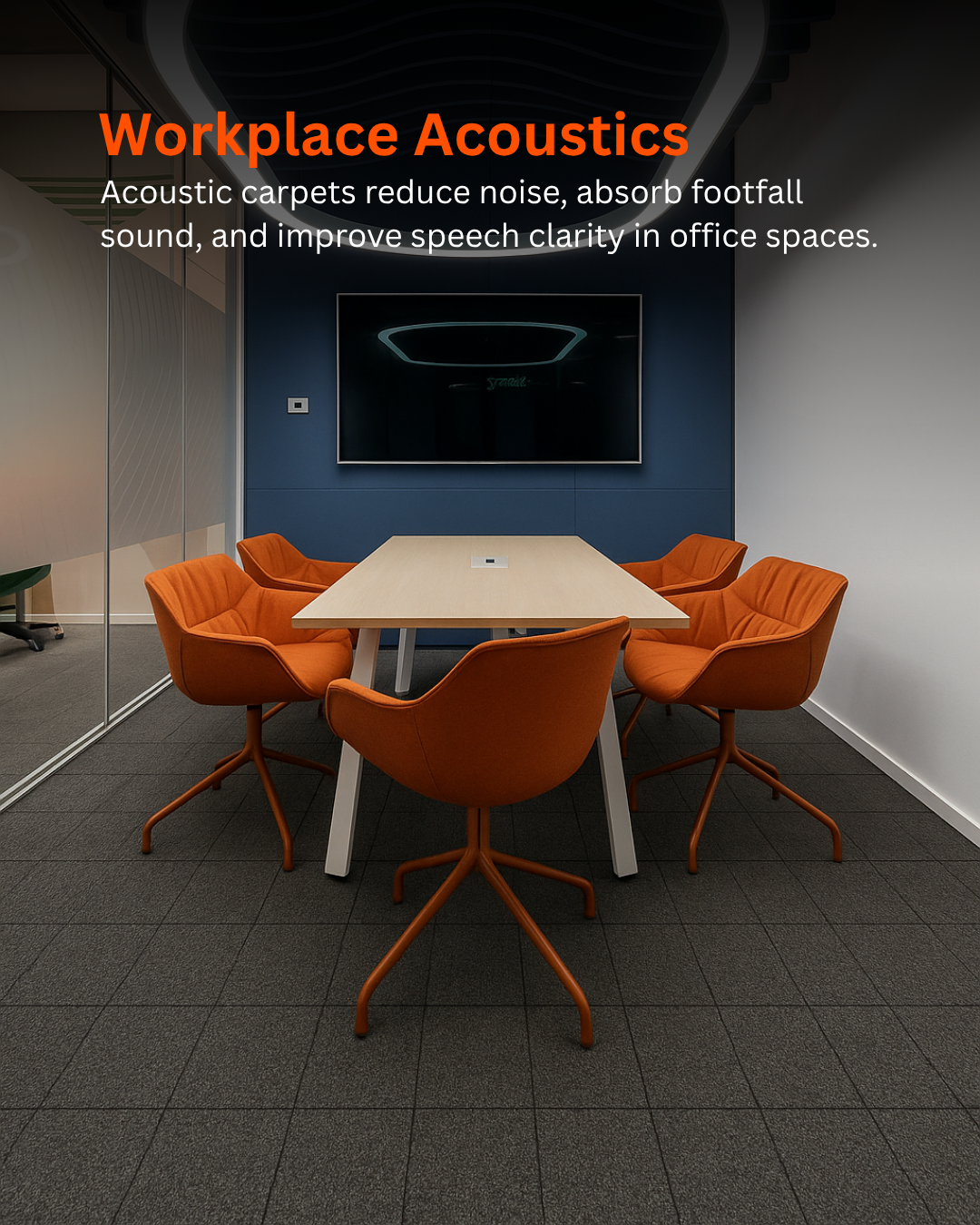 Acoustic Carpet Tiles combine luxurious flooring aesthetics with effective sound absorption and comfort. Made from high-density polyester fiber with a soft felt backing, they reduce impact noise, footsteps, and sound reflections while adding warmth and elegance to interiors. Ideal for offices, hotels, home theatres, classrooms, and luxury homes, they enhance both style and acoustic performance.