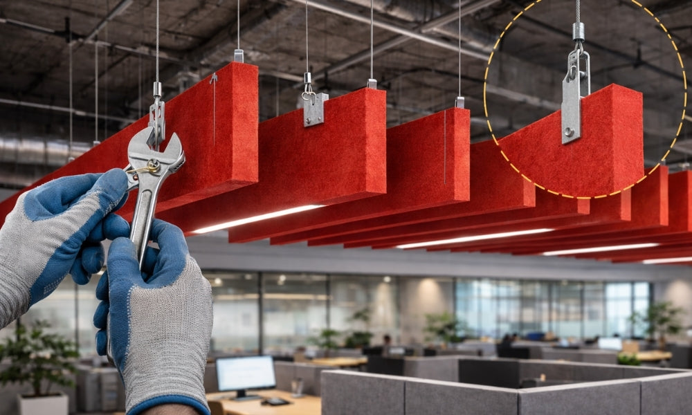 Suspension systems allow straightforward installation using cables or mounting hardware. No full ceiling grid is required. Proper alignment and spacing are essential for uniform acoustic results.