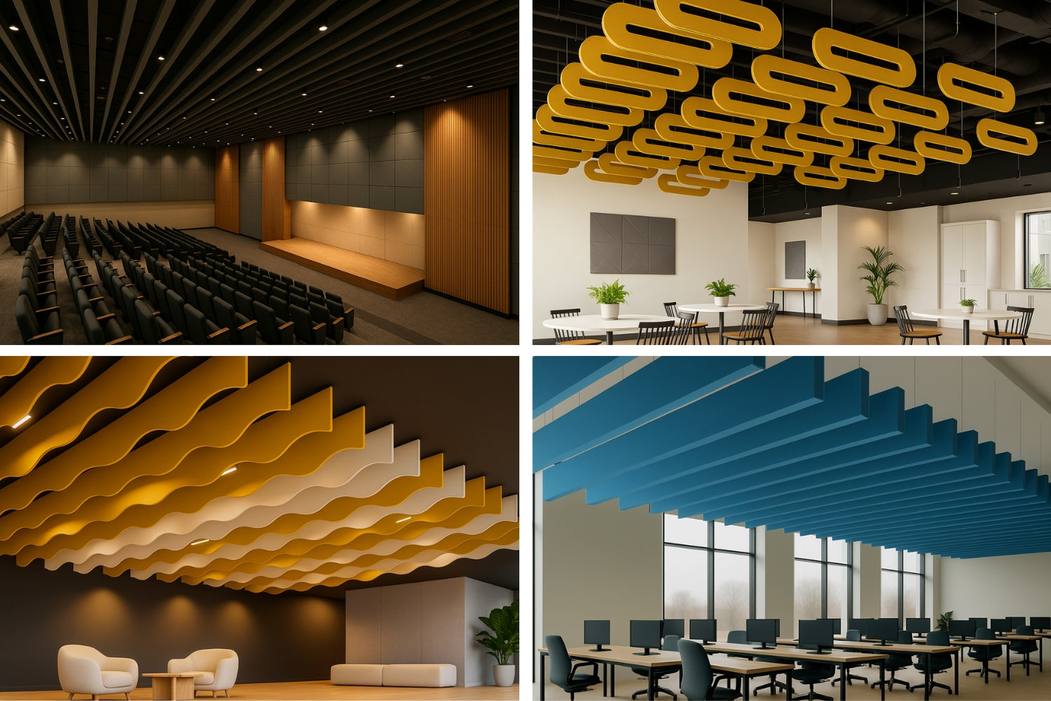 Recommended for offices, auditoriums, cafeterias, classrooms, call centers, and retail environments. They are especially effective in large-volume spaces. Performance improves when combined with wall treatments.