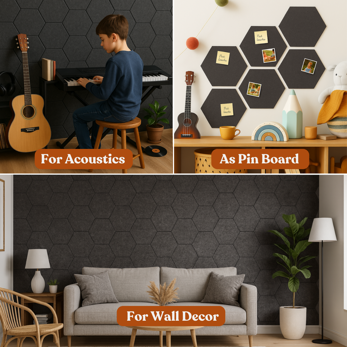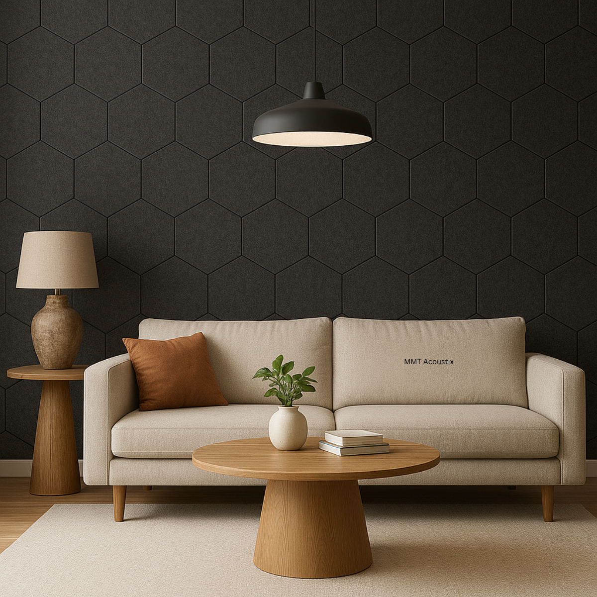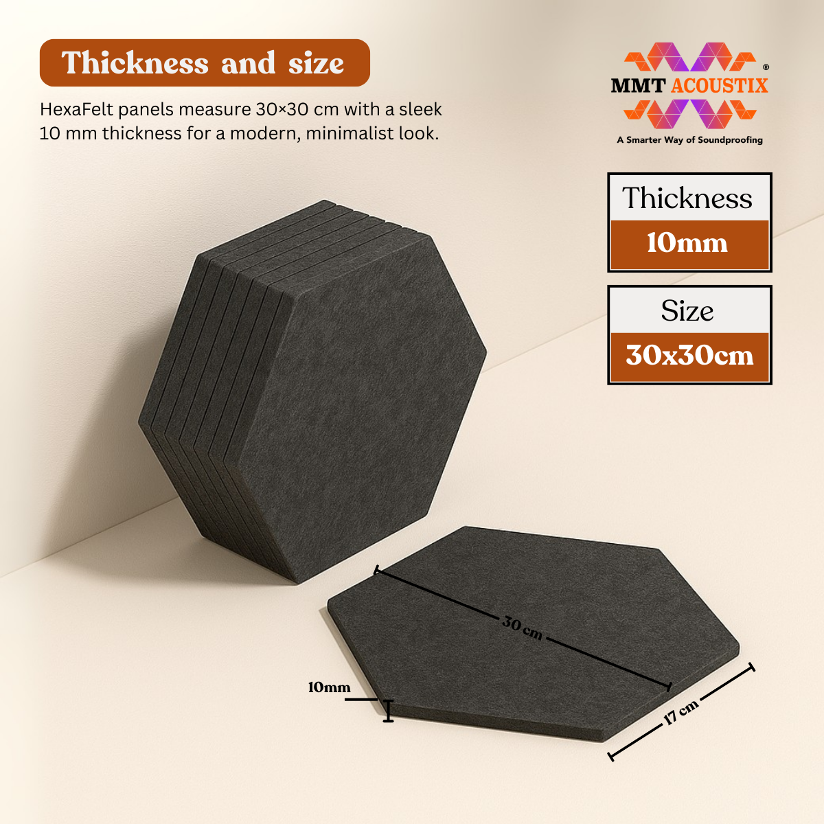 HexaFelt Bevelled Hexagon Acoustic Panels combine modern geometry with premium sound absorption, crafted from 10mm high-density polyester felt for both acoustic and aesthetic excellence. Their bevelled edges and modular hexagon design allow creative wall compositions that add visual depth while improving sound clarity and reducing echo. Perfect for living areas, offices, classrooms, studios, home theatres, and luxury interiors, HexaFelt transforms walls into functional art.