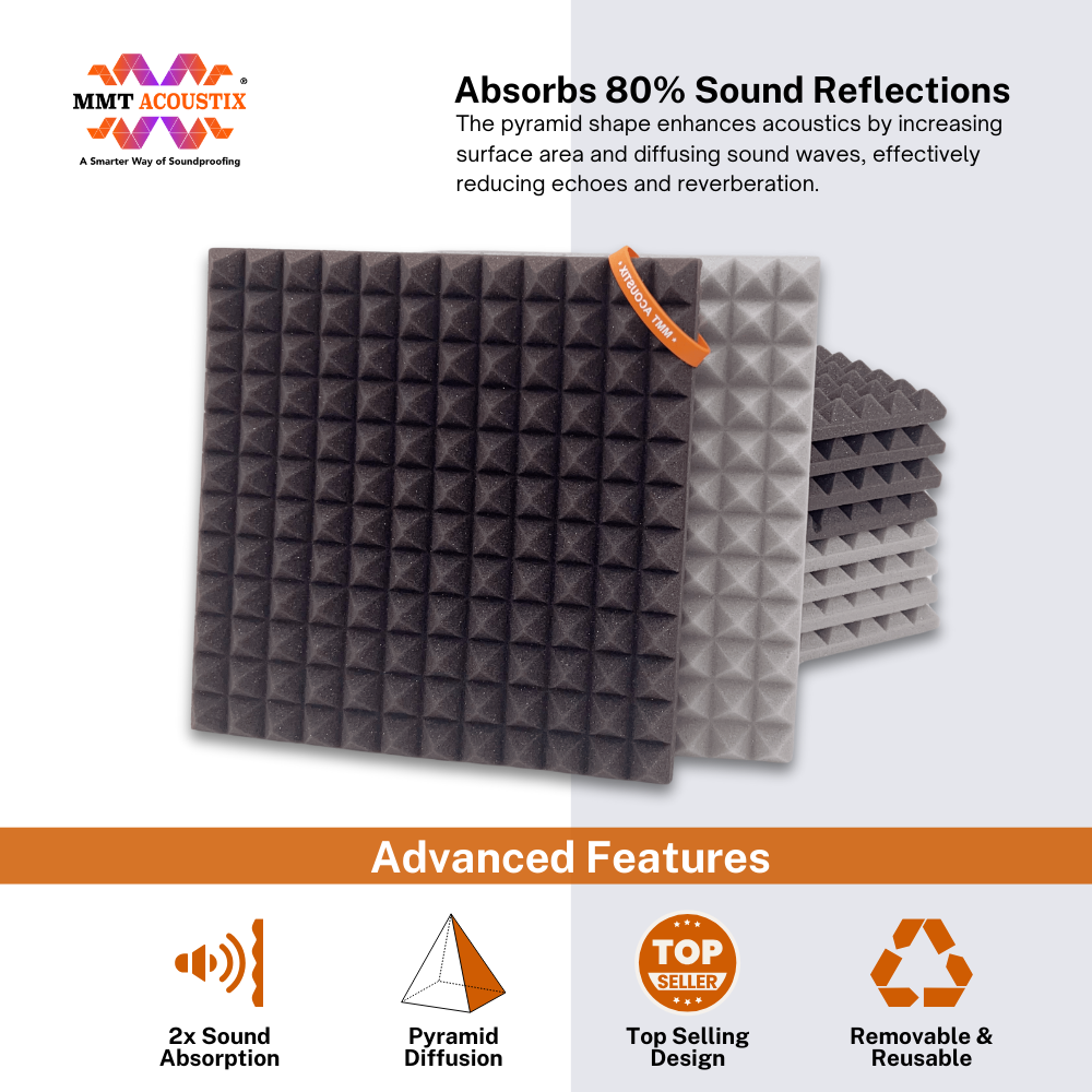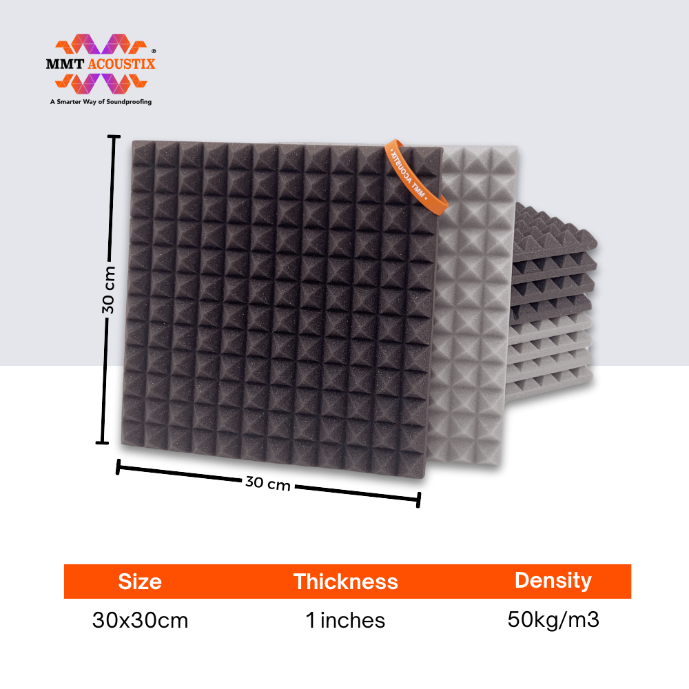 Each Pyramid Acoustic Foam 1" panel measures 1x1 ft (12x12 inches) with a thickness of 25 mm and a ±5% size tolerance. Minor shade variations are natural to polyurethane foam.