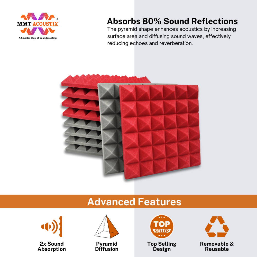 Pyramid Acoustic Foam 2”, 1x1 Ft, Stone White + Flame Red
