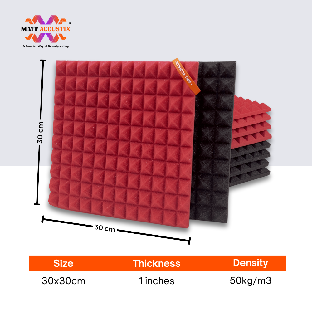 Pyramid Acoustic Foam 1”, 1x1 Ft, Charcoal + Flame Red