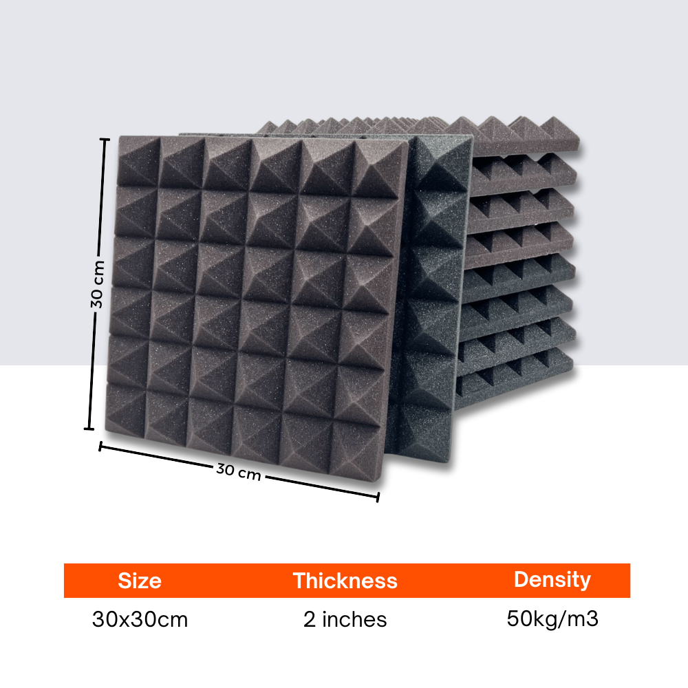 Each Pyramid Acoustic Foam 2" panel measures 1x1 ft (12x12 inches) with a thickness of 43 mm and a ±5% size tolerance. Minor shade variations are natural to polyurethane foam.
