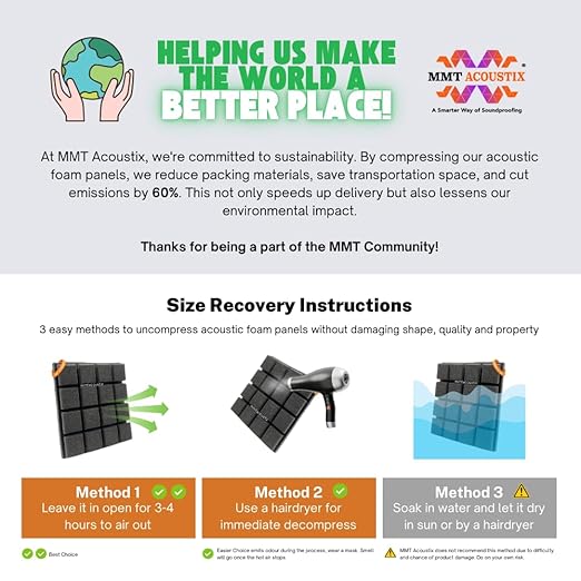 Each Turbo Acoustic Foam panel measures 6x3 ft (36x72 inches) with a thickness of 43 mm and a ±5% size tolerance. Minor shade variations are natural to polyurethane foam.