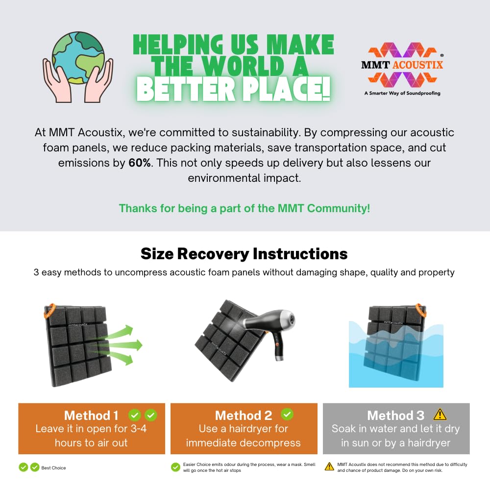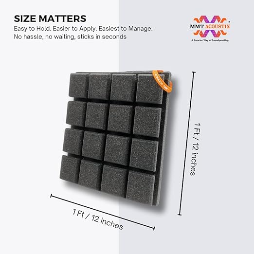 Each Turbo Acoustic Foam panel measures 1x1 ft (12x12 inches) with a thickness of 43 mm and a ±5% size tolerance. Minor shade variations are natural to polyurethane foam.